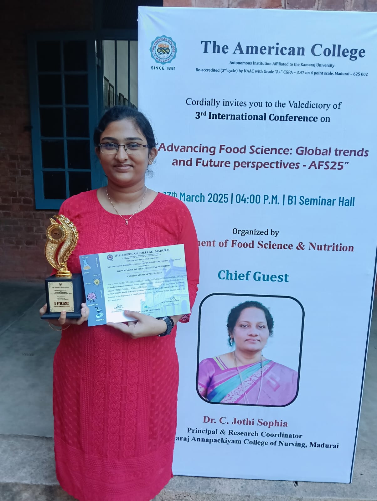 Ms. B.R. Harshinee – Won Ist Prize in Paper Presentation in 3rd International Conference on “Advancing Food Science: Global Trends and Futurre perspectives – AFS25 on March 12 and 13, 2025